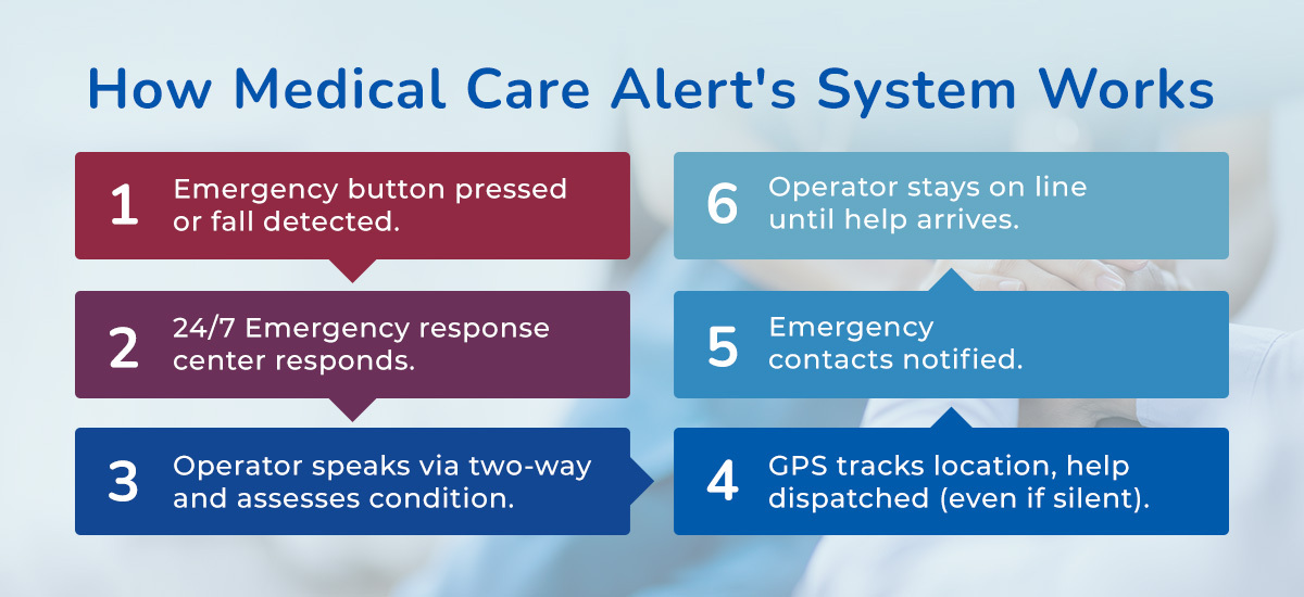 A medical alert system lets your loved one get immediate help in an emergency. They can easily press a button and speak directly to an emergency response agent. Medical Care Alert's systems can also automatically detect most falls to alert caregivers and dispatch emergency responders. Our agents will send help even if your loved one can't push their alert button or has trouble communicating clearly.